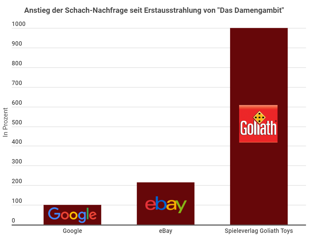 Spieleverlage verkaufen seit der Erstausstrahlung der Netflix-Erfolgsserie bis zu 1.000 Prozent mehr Schachbretter. Bereits wenige Tage, nach dem die Serie rund um die Schachspielerin Elizabeth Beth Harmon dem Publikum zugänglich war, gingen die Suchanfragen bei Google & Co. durch die Decke. Wie aus einer neuen „Handelskontor“-Infografik hervorgeht, hält der Trend nach wie vor an.