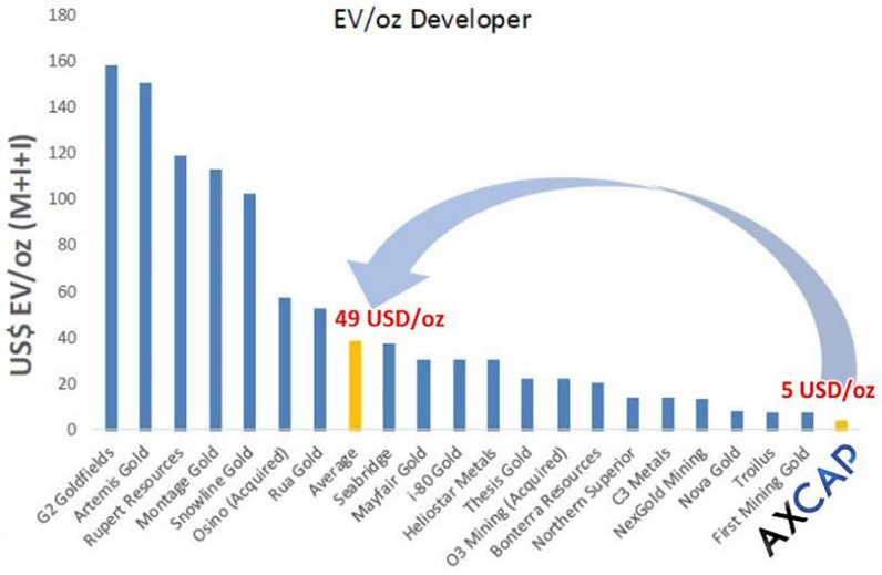 Setzt man die aktuelle Marktkapitalisierung von rund 39 Mio. USD ins Verhältnis, wird AXCAP Ventures (WKN: A40A7B / ISIN: CA05455X2059) mit nur 4,93 USD pro Unze Gold bewertet, während der Durchschnitt für Goldentwickler bei rund 49 USD liegt. Faktor 10x! (Stand Mai 2025)